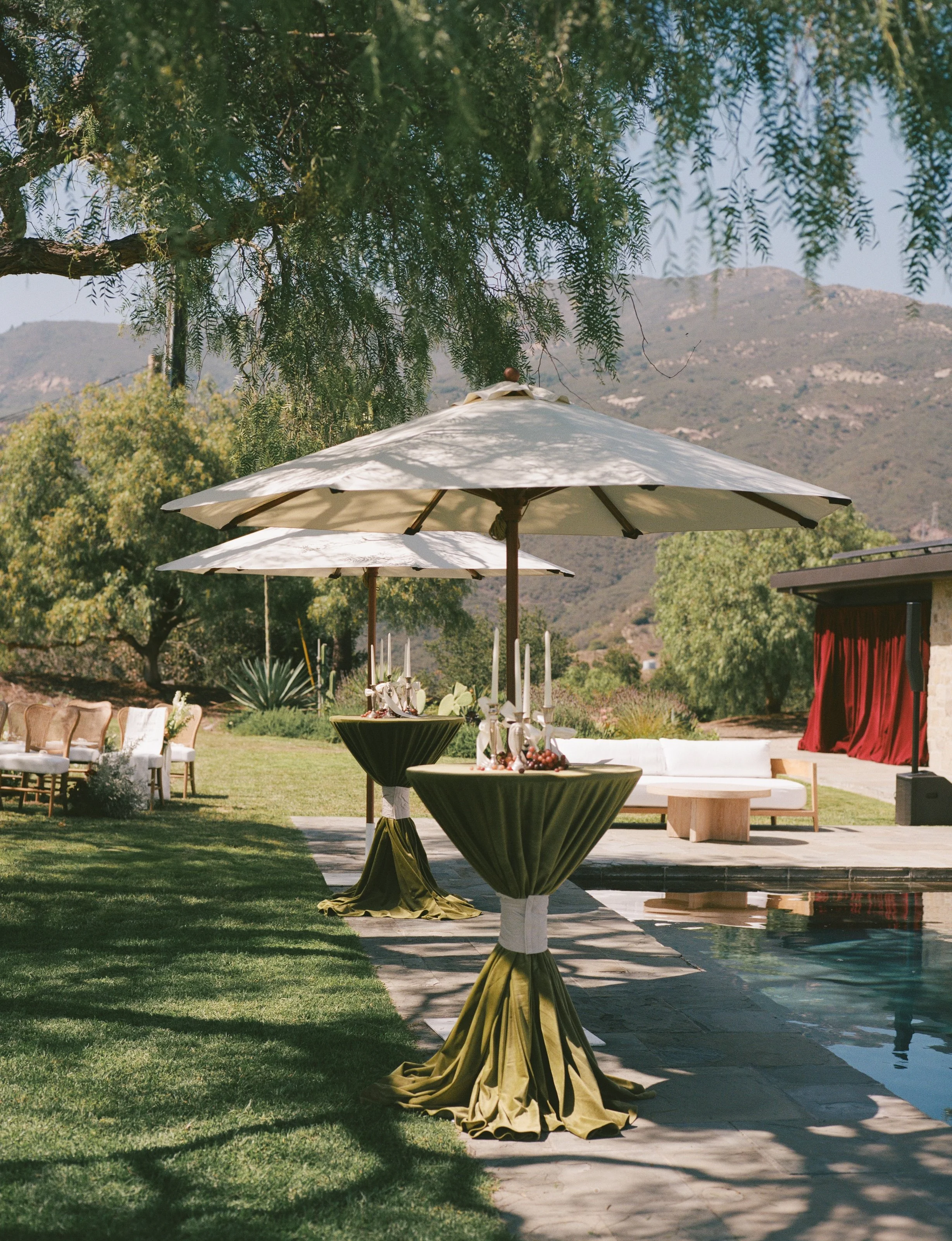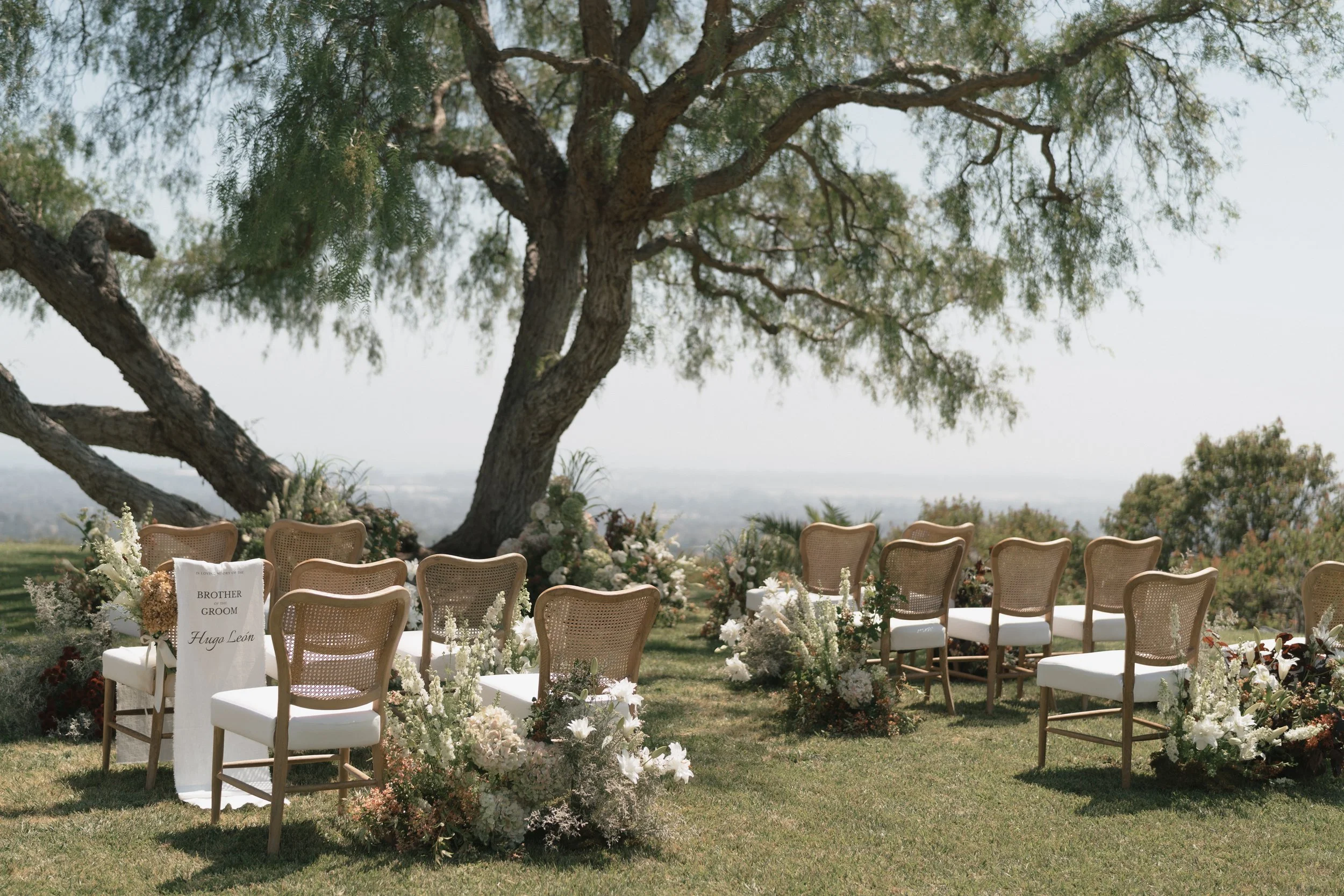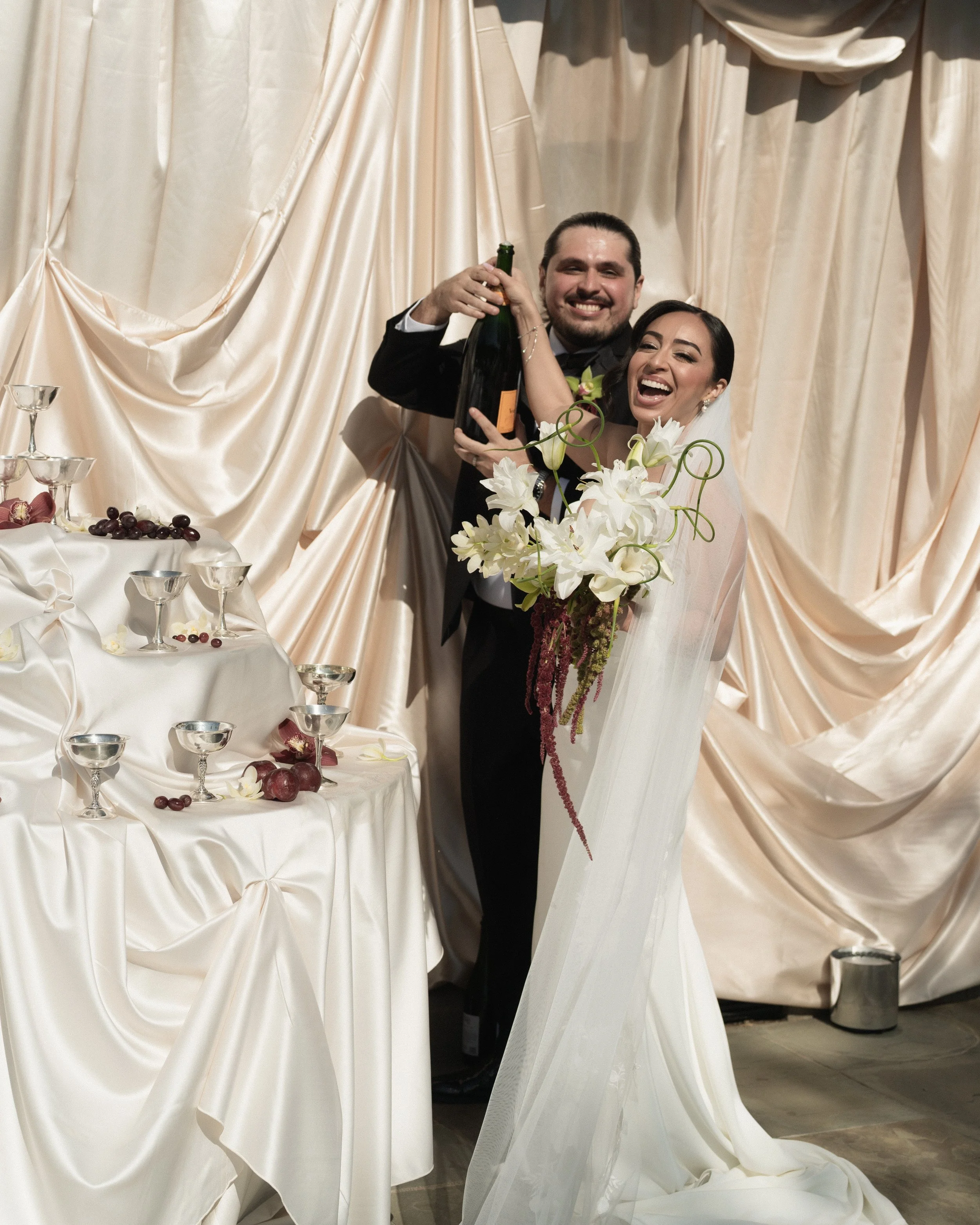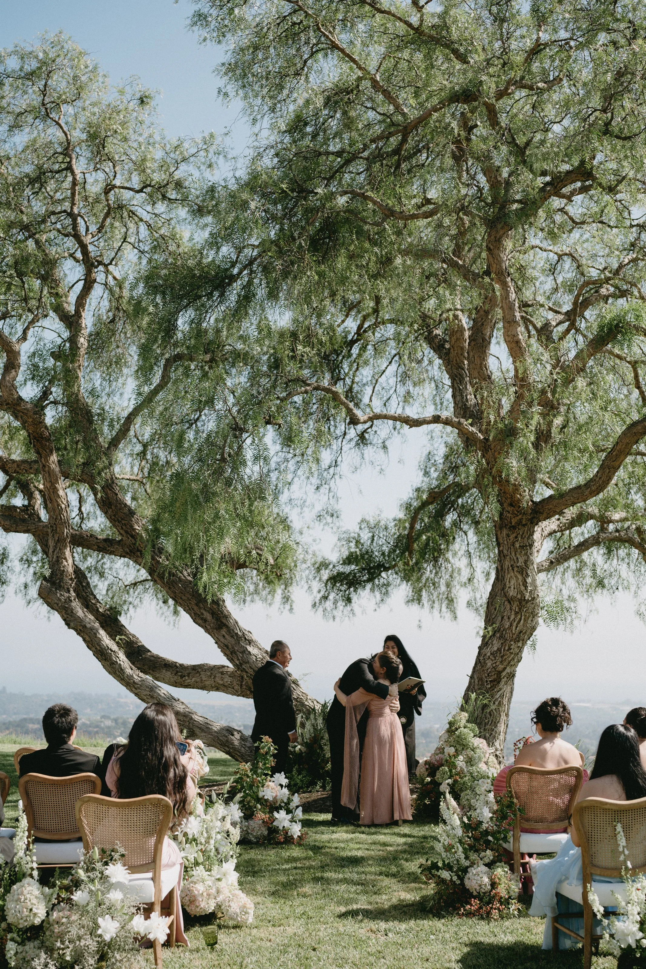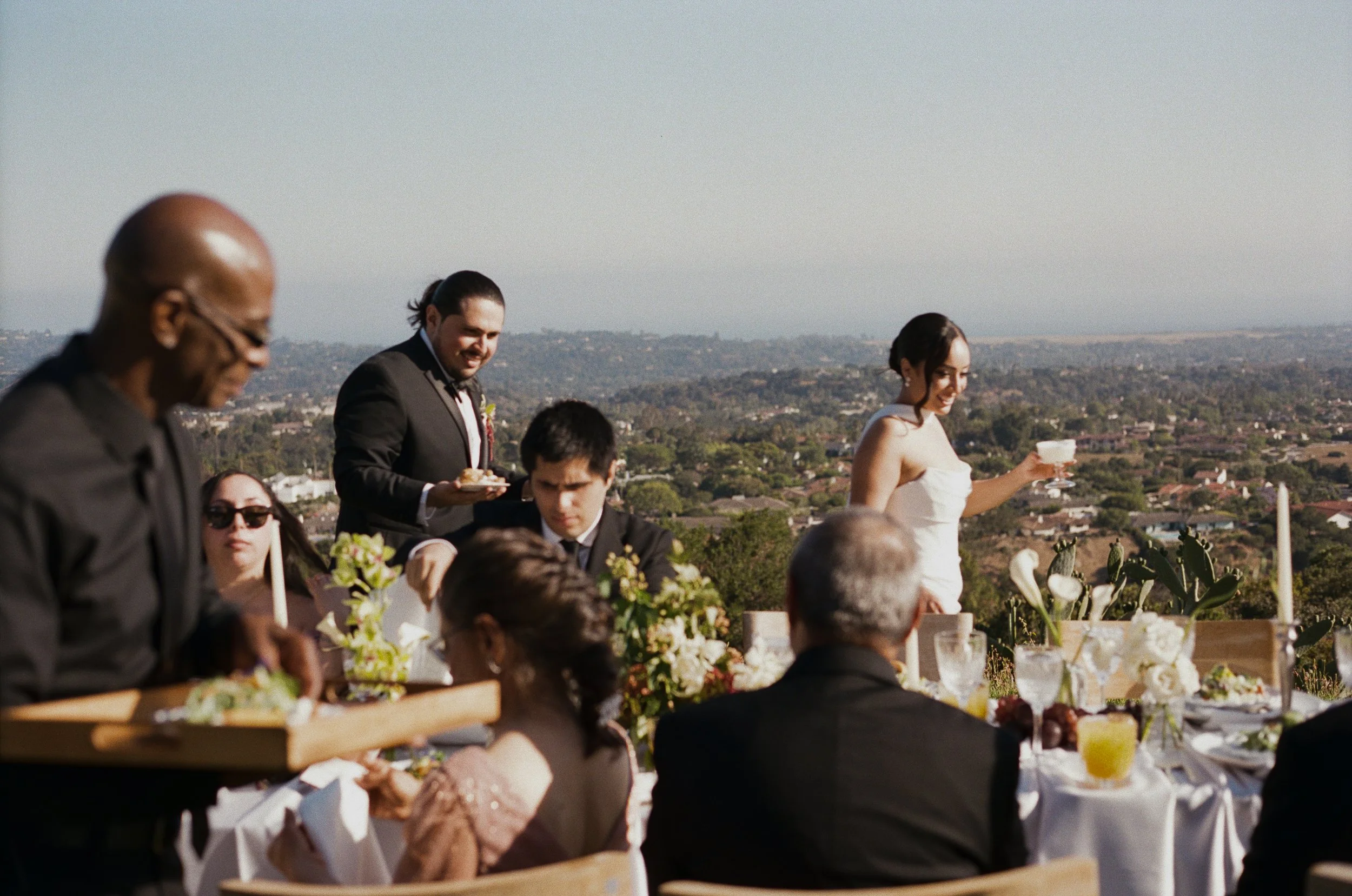 The ceremony featured a dramatic yet ethereal floral backdrop, seamlessly transitioning into a European-style dinner on the grass. Thoughtful personal details- from curated cocktails honoring family traditions to playful nods like a champagne tower and cascading floral cake table- ensured the celebration felt both refined and full of heart. Timeless, romantic, and effortlessly elevated, this Santa Barbara wedding was a true expression of gathering, beauty, and connection.