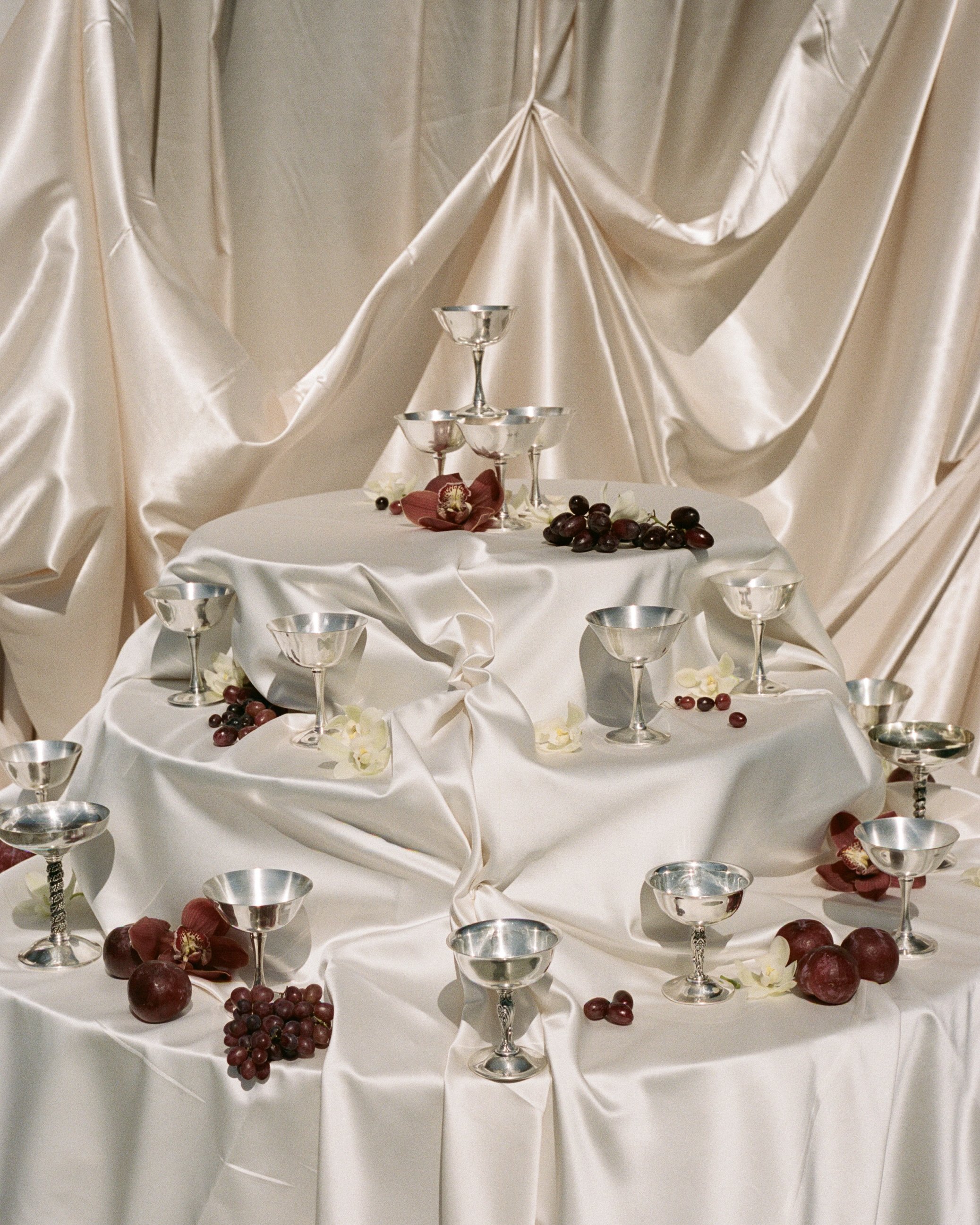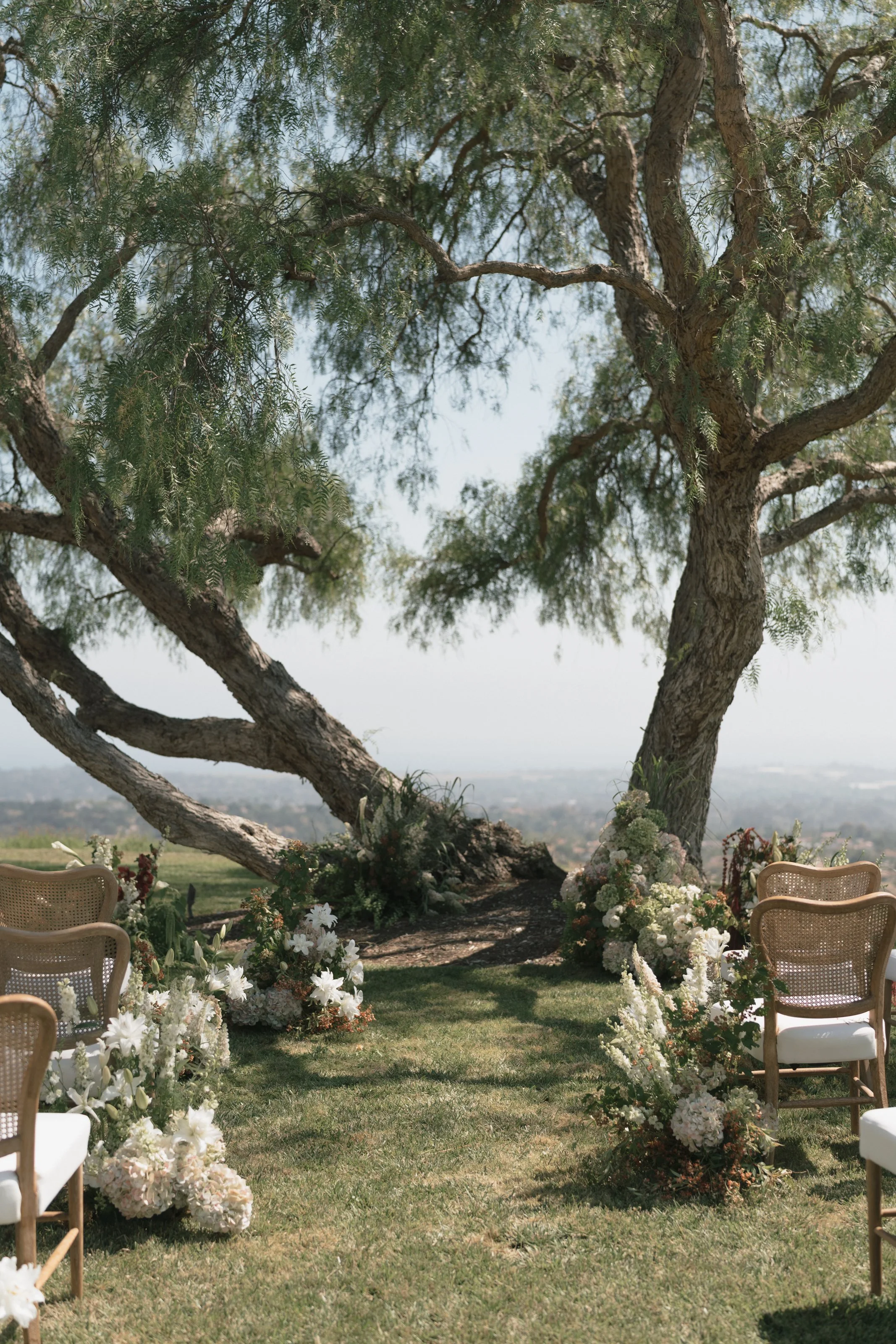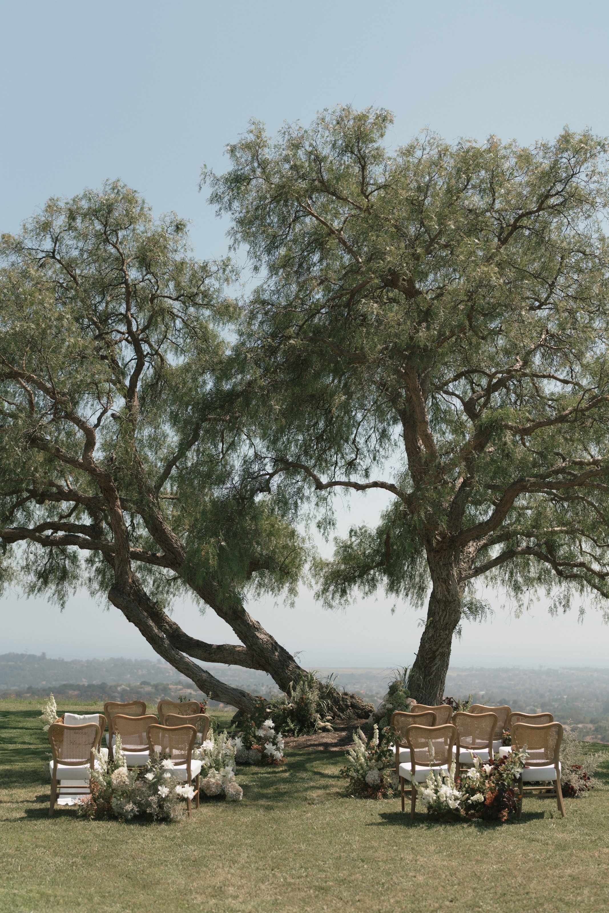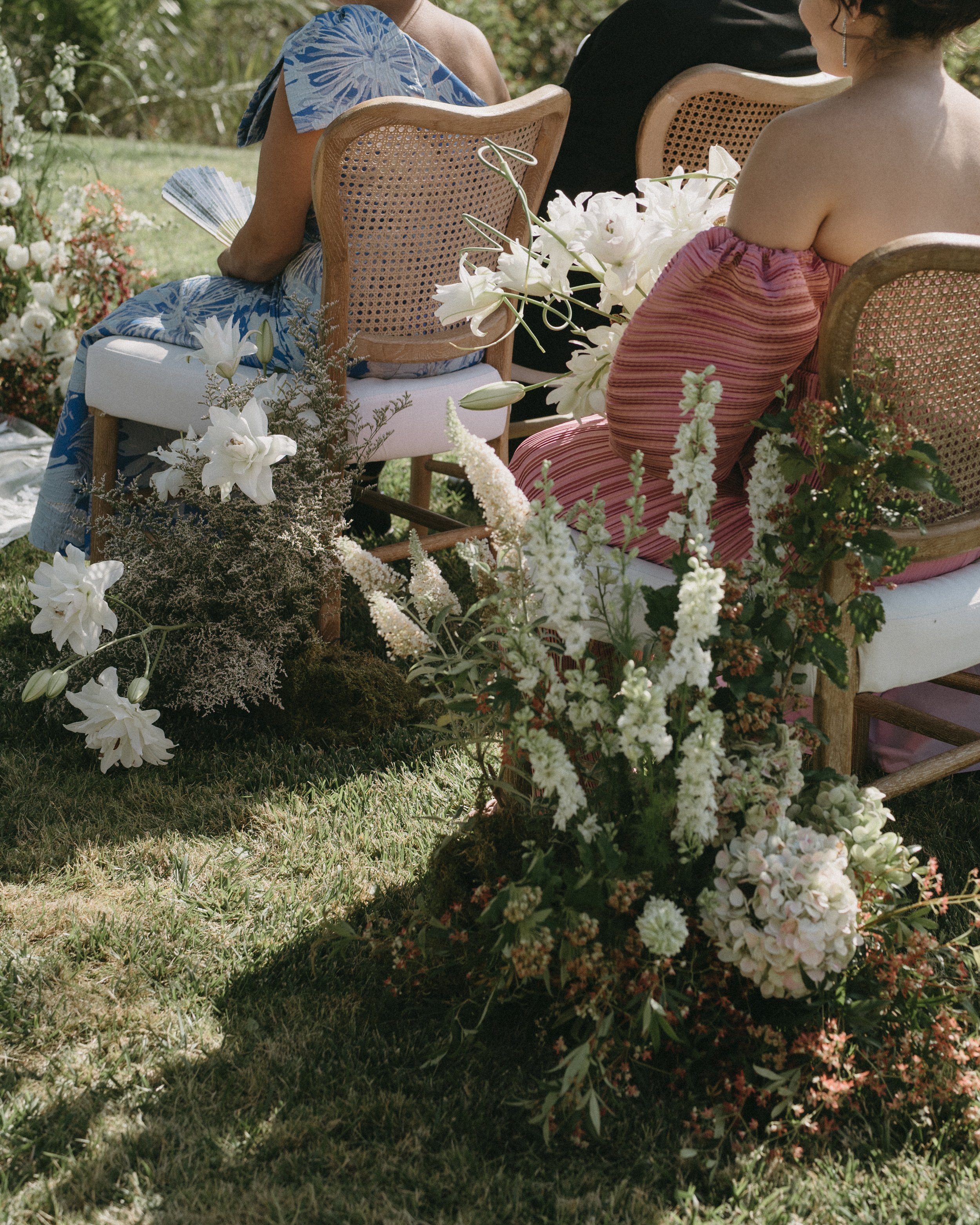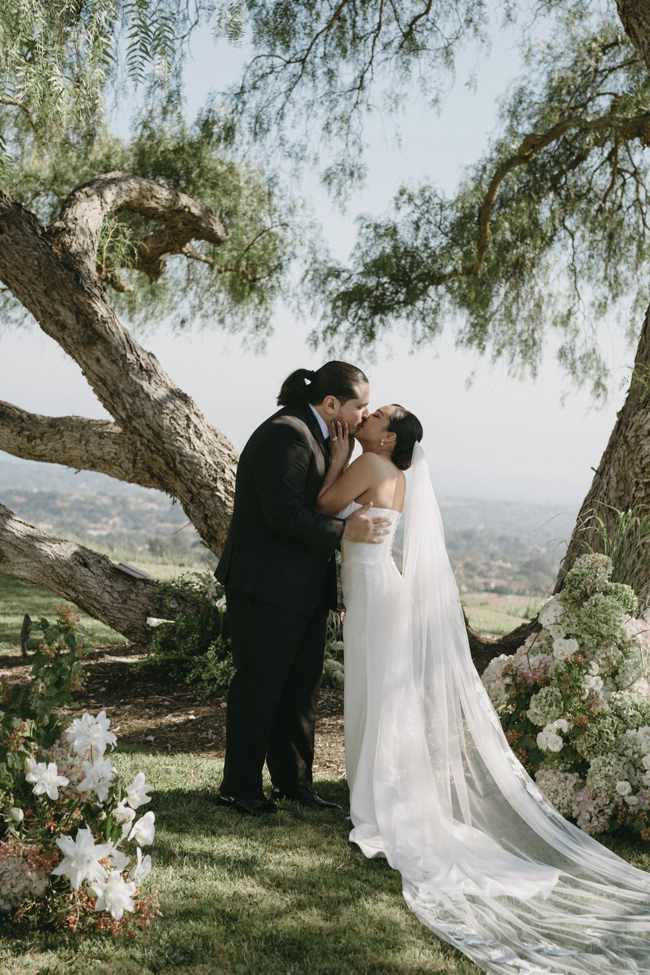 The ceremony featured a dramatic yet ethereal floral backdrop, seamlessly transitioning into a European-style dinner on the grass. Thoughtful personal details- from curated cocktails honoring family traditions to playful nods like a champagne tower and cascading floral cake table- ensured the celebration felt both refined and full of heart. Timeless, romantic, and effortlessly elevated, this Santa Barbara wedding was a true expression of gathering, beauty, and connection.