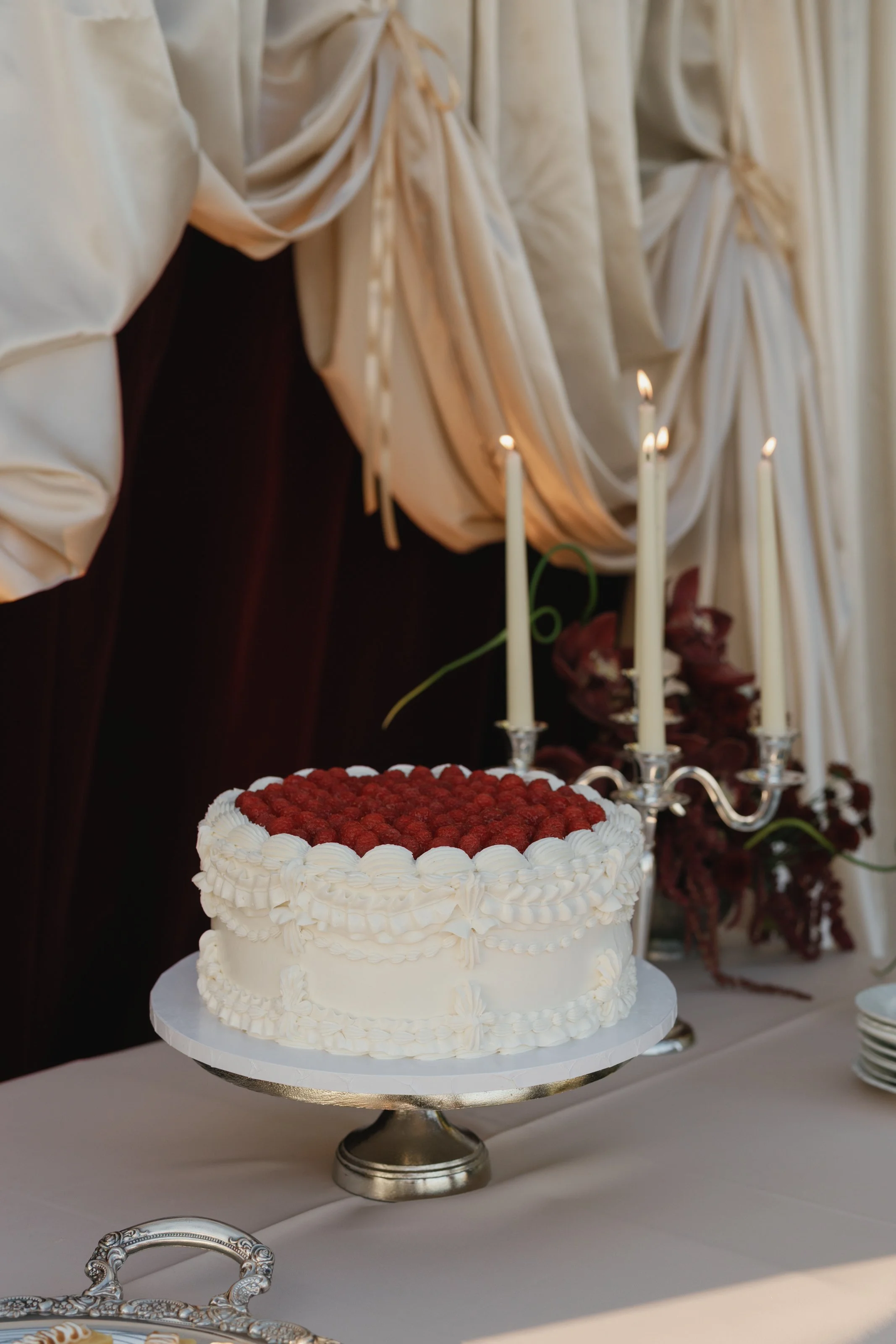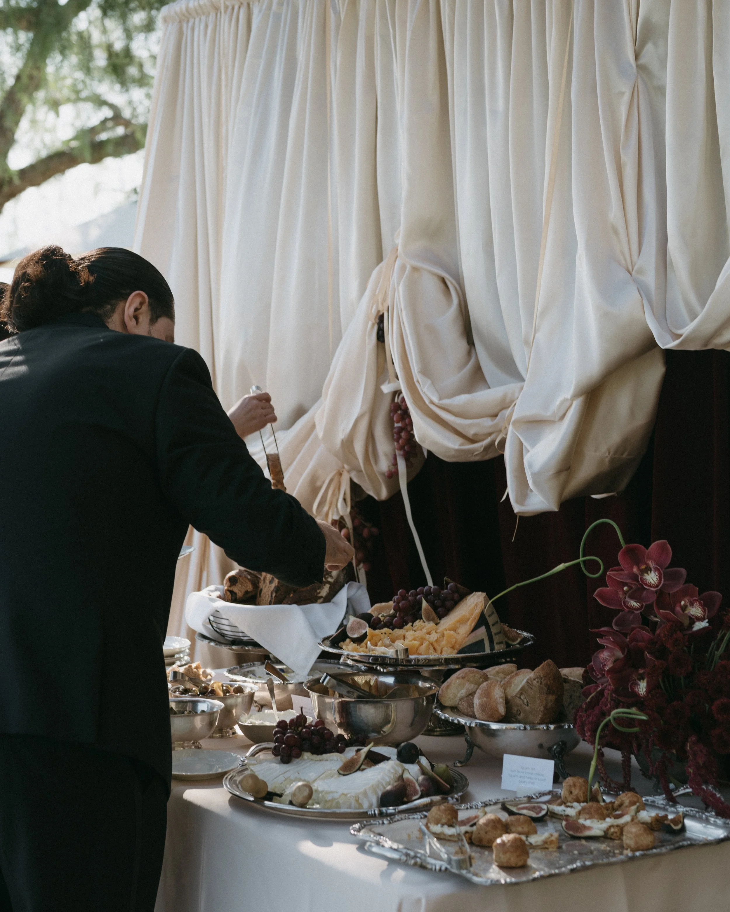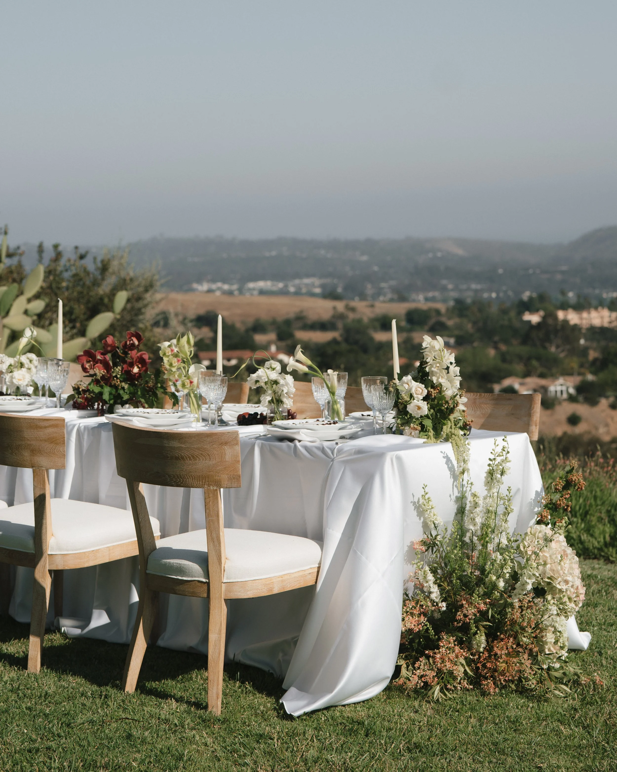 Blending coastal ease with European elegance, the design layered soft neutrals with touches of deep burgundy to create depth and warmth. Flowing linens, vintage silverware, and sculptural draping florals brought an artful softness to the setting, while long tables dressed in candlelight and textured glassware encouraged a relaxed, communal atmosphere.
